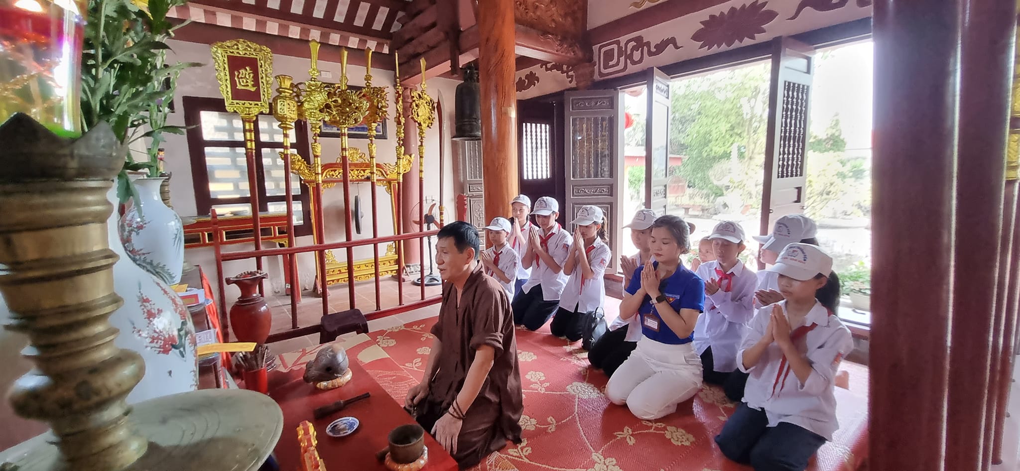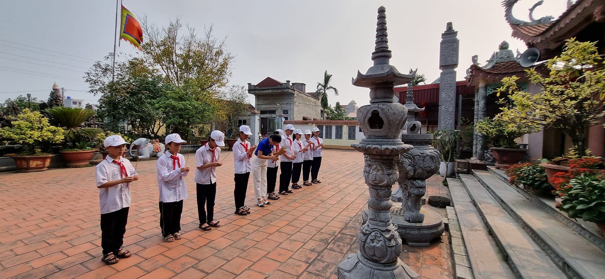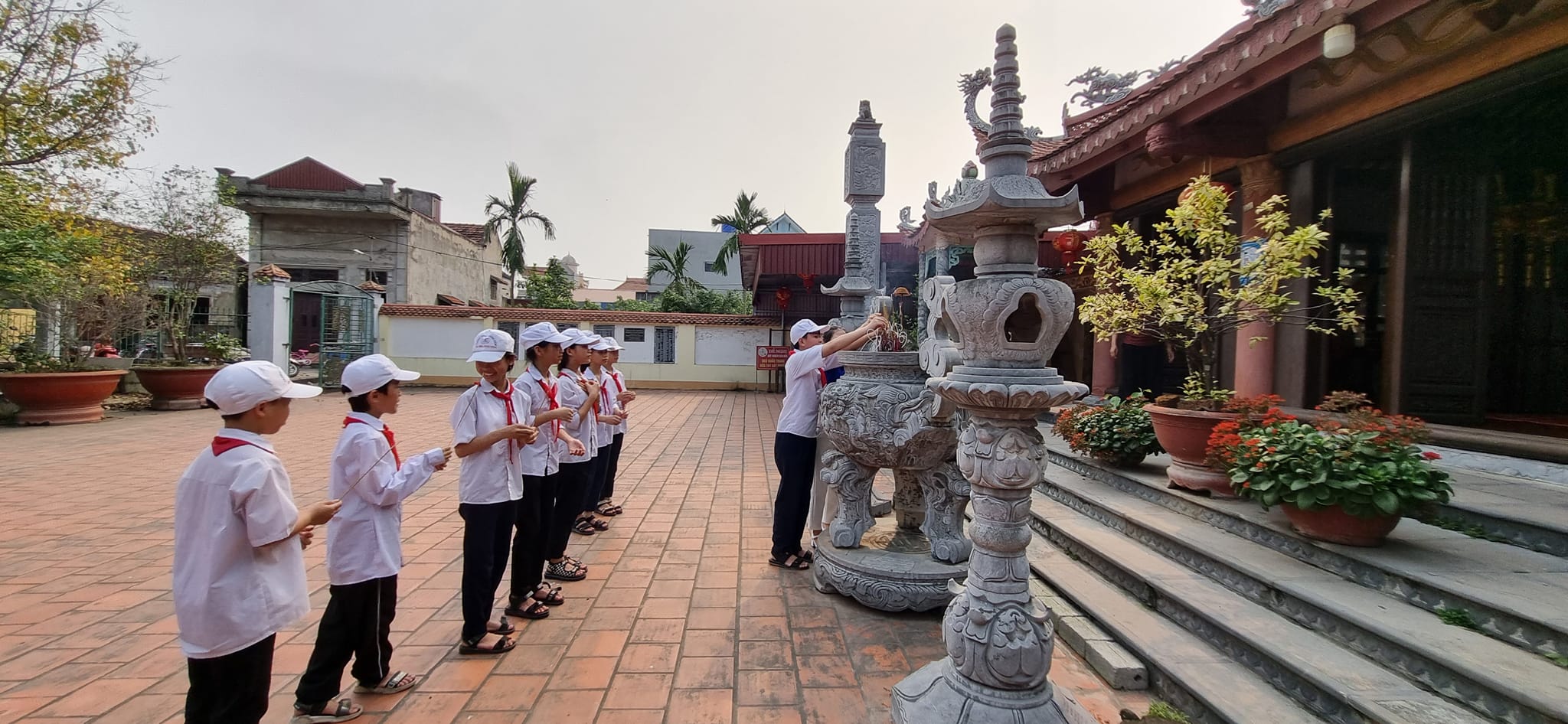 Vào những dịp cuối tuần, ngày lễ lớn hay các hoạt động theo chủ điểm, hình ảnh các đội viên trong màu khăn quàng đỏ thắm, nghiêm trang xếp hàng trước sân đền, sân đình đã trở nên quen thuộc. Các em cùng nhau quét dọn sân gạch, lau chùi ban thờ, chăm sóc cây xanh, nhổ cỏ quanh khuôn viên. Mỗi việc làm tuy nhỏ nhưng đều được thực hiện bằng sự cẩn trọng và lòng thành kính. Không gian vốn cổ kính của di tích vì thế luôn sạch đẹp, trang nghiêm. Nghi thức dâng hương được tổ chức trang trọng, thể hiện sự biết ơn đối với các bậc tiền nhân đã có công dựng làng, giữ nước. Trong làn khói hương trầm quyện nhẹ, các em lắng nghe thầy cô giới thiệu về lịch sử Đền Kinh, về giá trị văn hóa của Đình làng Thượng Kiệm, về những truyền thống đáng tự hào của quê hương. Những câu chuyện ấy không chỉ giúp các em hiểu thêm về nguồn cội mà còn bồi đắp niềm tự hào, ý thức gìn giữ bản sắc văn hóa dân tộc. Hoạt động chăm sóc và dâng hương tại hai di tích không đơn thuần là một buổi lao động hay một nghi lễ. Đó còn là bài học sống động về đạo lý “Uống nước nhớ nguồn”, về trách nhiệm của thế hệ trẻ đối với di sản quê hương. Thông qua các hoạt động ấy, Đội Thiếu niên của trường thêm phần sôi nổi, thiết thực và giàu ý nghĩa giáo dục. Mỗi đội viên không chỉ trưởng thành hơn trong nhận thức mà còn rèn luyện được tinh thần đoàn kết, ý thức tập thể và lòng kính trọng đối với truyền thống.